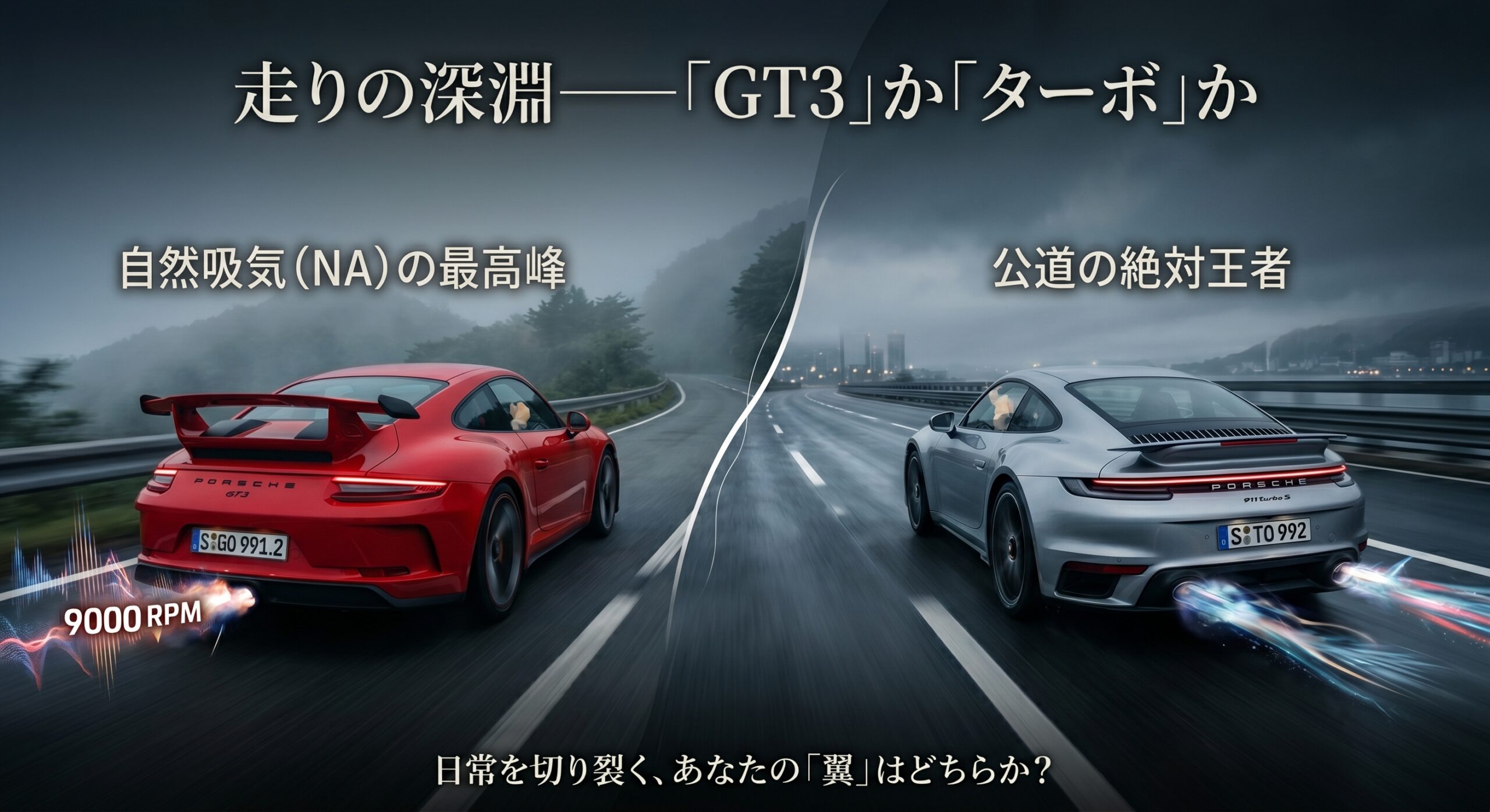 ターボの圧倒的な過給を選ぶか、GT3のヒリヒリするようなNAの極致を選ぶか。